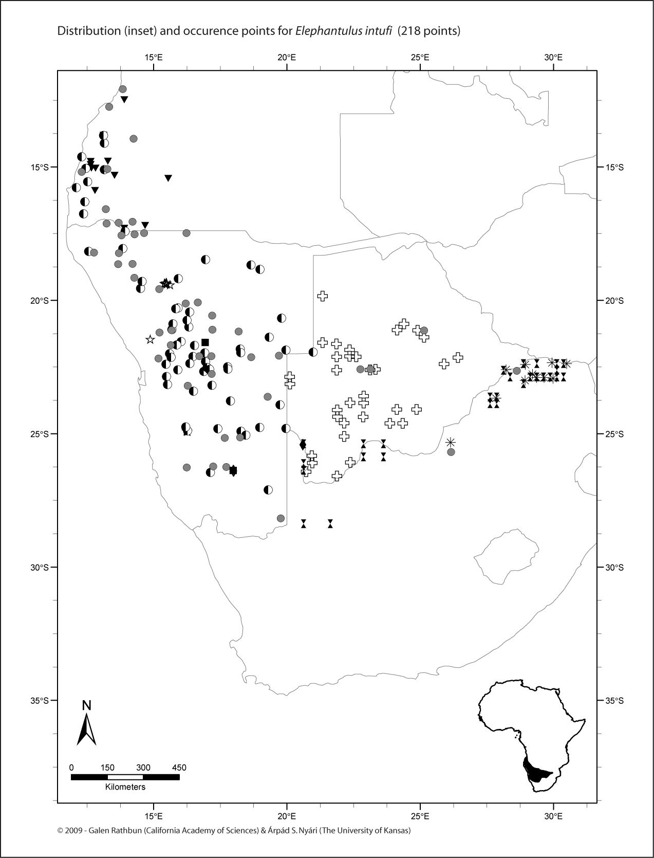 Scientific and common names of sengis (1 family, 2 subfamilies, and 20 species), including species abbreviation in parentheses (for distribution table), IUCN Red List conservation status in brackets (EN=endangered, VU=vulnerable, NT=near threatened, LC=least concern, and DD=data deficient). Older individual distribution maps can be seen by clicking on a matrix cell corresponding to species and data set date. For key to map symbols (data sources), click HERE [100 KB PDF]. Maps (2009 version) were compiled by Galen Rathbun (California Academy of Sciences) and Arpad Nyari (University of Kansas, Natural History Museum) based on a 3 March 2009 data set with 2348 records, compared to the 2008 maps based on a 2008 data set that included 1241 records. The 2008 maps were the basis for the distribution maps found in Mammals of Africa book (2013), whereas the IUCN maps are based on the 2009 data set. The current (2012 data set) contains 2366 records.